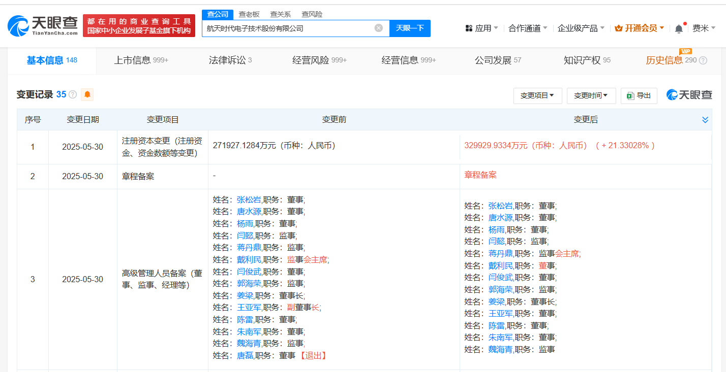 天眼查App显示,近日,航天电子(600879)发生工商变更,注册资本由约27.2亿人民币增至约33亿人民币,增幅约21%,同时部分高管发生变更。